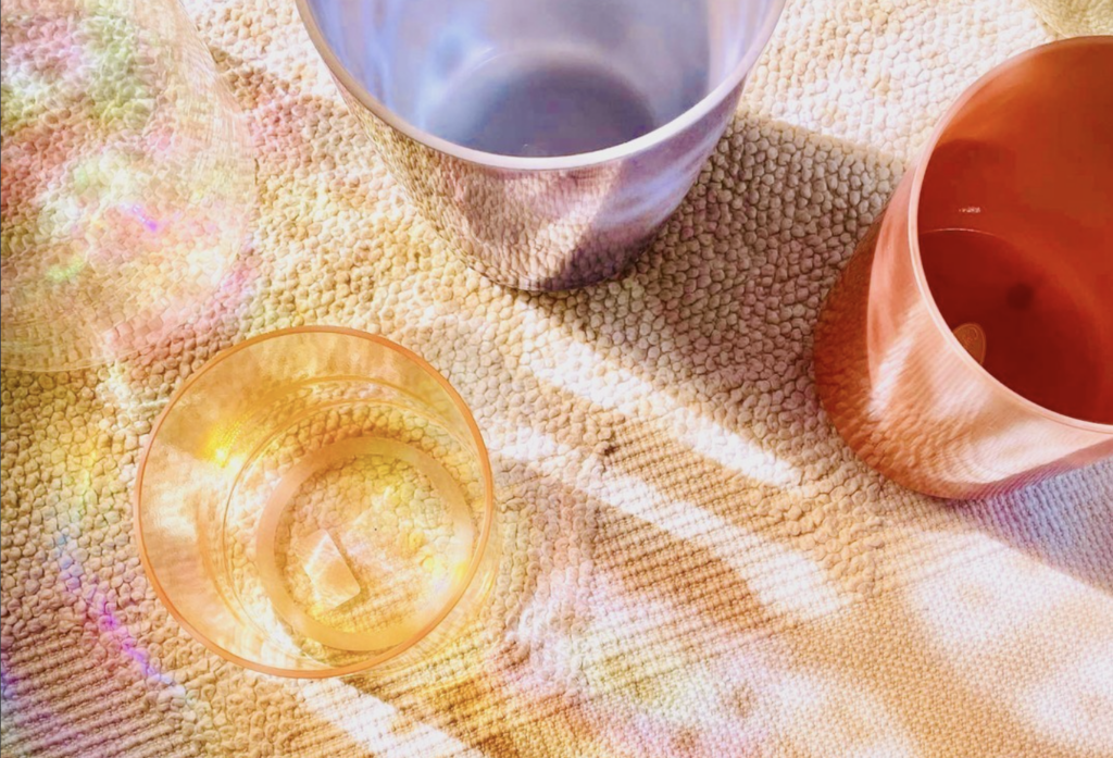 The crystal bowls produce soft, resonant sounds with powerful vibrational qualities that are felt by both body and mind.